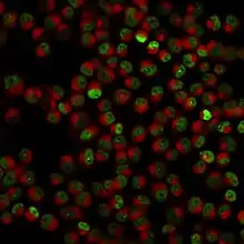 - 1 2 Norton JT, Wang C, Gjidoda A, Henry RW, Huang S (February 2009). "The perinucleolar compartment is directly associated with DNA". The Journal of Biological Chemistry. 284 (7): 4090–4101. doi:10.1074/jbc.M807255200. PMC 2640956. PMID 19015260.