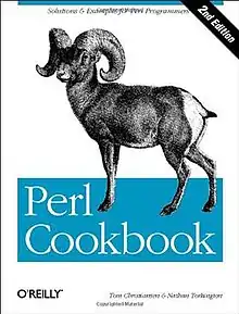 The Perl Cookbook, ISBN 0-596-00313-7, is a book containing solutions to common short tasks in Perl. Each chapter covers a particular topic area ("Strings", "Ties, Objects, and Classes", "CGI")[1] and is divided into around a dozen recipes each on a particular problem ("Reversing A String By Word Or Character", "Accessing Overridden Methods", "Managing Cookies"). Each recipe has four parts: "Problem", "Solution", "Discussion", and "See Also".