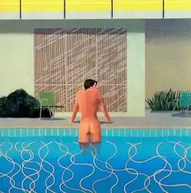 Hockney moved from England to California in 1964, drawn by its sleek modernist aesthetic and warm Mediterranean climate.[1] In 1966, while teaching at UCLA, Hockney met the American art student Peter Schlesinger. The two became lovers, and Hockney started painting a series of pool pictures, often featuring Schlesinger. A few of these, such as Peter Getting Out of Nick's Pool (1966), A Bigger Splash (1967) and Portrait of an Artist (Pool with Two Figures) (1972), later achieved iconic status. On 15 November 2018, the latter set a world record for the most expensive work of art ever sold at auction by a living artist.[2]