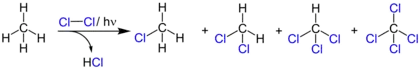 Subsequent products of photochlorination of methane (schematic representation without consideration of stoichiometry).
