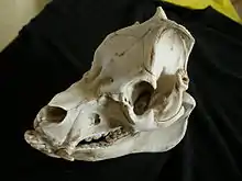 The pig typically has a large head, with a long snout which is strengthened by a special prenasal bone and a disk of cartilage at the tip.[2] The snout is used to dig into the soil to find food and is a very acute sense organ. The dental formula of adult pigs is 3.1.4.33.1.4.3, giving a total of 44 teeth. The rear teeth are adapted for crushing. In the male, the canine teeth can form tusks, which grow continuously and are sharpened by constantly being ground against each other.[2]