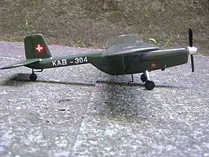The first company proposal to the Swiss Air Force was a single-seat trainer, designated the P-1, although no records exist of the work done on it and not even the name of the project was ever mentioned[9] on the two drawings that were discovered in the federal archives.[10] The next project was the detail construction of the SB-2 Pelican which had been designed by the Swiss Federal Institute of Technology.[11] The five-seat experimental aircraft first flew on 30 May 1944 and only one of the type was built - resulting in a financial loss for the company that was higher than what it was ever paid for.[12]