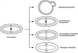 - 1 2 Gupta RS, Bhandari V, Naushad HS (2012). "Molecular Signatures for the PVC Clade (Planctomycetes, Verrucomicrobia, Chlamydiae, and Lentisphaerae) of Bacteria Provide Insights into Their Evolutionary Relationships". Frontiers in Microbiology. 3: 327. doi:10.3389/fmicb.2012.00327. PMC 3444138. PMID 23060863.