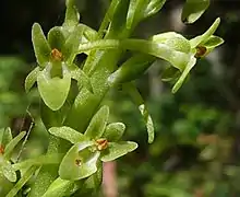 Platanthera michaelii is an uncommon species of orchid known by the common names Michael's rein orchid and Michael's piperia. It is endemic to California, where it is known from the coastal plains, hills, and mountains, and the Sierra Nevada foothills. It can be found in varied habitat, including scrub, woodland, and forest. This orchid grows erect to about 70 centimeters in maximum height from a bulbous caudex. The basal leaves are up to 24 centimeters long by 5 wide. Leaves higher on the stem are much reduced. The upper part of the stem is a spikelike inflorescence of many yellow-green flowers which are fragrant in the evenings.