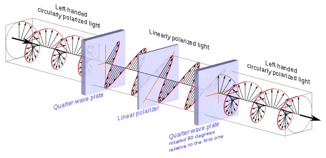 Circular polarizer creating left-handed circularly polarized light. It is considered left-handed as viewed from the receiver and right-handed as viewed from the source.[11]