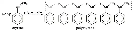 Polystyrene is an addition polymer that results when styrene monomers polymerize (interconnect). In the polymerization, the carbon-carbon π bond of the vinyl group is broken and a new carbon-carbon σ bond is formed, attaching to the carbon of another styrene monomer to the chain. Since only one kind of monomer is used in its preparation, it is a homopolymer. The newly formed σ bond is stronger than the π bond that was broken, thus it is difficult to depolymerize polystyrene. About a few thousand monomers typically comprise a chain of polystyrene, giving a molar mass of 100,000–400,000 g/mol.