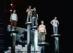 While promoting their performance at Rock in Rio in 2001, the band stated production was underway on their forthcoming tour. Following the performance, SFX Entertainment announced the band was planning a summer concert tour to promote their upcoming album. Band member Lance Bass said the inspiration for the tour's concept was the film 2001: A Space Odyssey, saying, "We wanted to do 2001: A Pop Odyssey and pay tribute to pop icons. So the whole tour revolves around the meaning of pop and what was popular from the '40s til today."[4] Initially, the tour was expected to begin May 12, 2001 at the Pro Player Stadium in Miami,[5] with English pop group BBMak slated to be the opening act.[6] PopOdyssey was considered "the largest production for a pop concert",[7] as the stage was five stories tall and included three video screens and five mini-stages.[8] The tour was then postponed to May 23, 2001, to ensure that the crew was able to complete the stage construction.[9] NSYNC's third studio album Celebrity was initially planned to be released on June 26, 2001,[10] but was moved to July 24, 2001. As a result, NSYNC decided to perform new songs from Celebrity on the tour before the album was released.[11] Additional tour dates were cancelled due to weather conditions in the South.[12] However, PopOdyssey was one of the most anticipated tours of 2001.[13] Two months into the tour, the band expressed hopes of later bringing their shows back to Europe, where they first toured before their American breakthrough,[14][15] in addition to Australia;[16] this did not come to fruition.