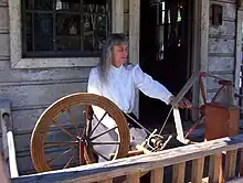 Just like the dancers to this jig, the spinner's weasel revolves, but to measure the thread or yarn produced on a spinning wheel.[6] Forty revolutions of most weasels produce eighty yards (73 m) of yarn or a skein.[24] The weasel's wooden gears are designed to make a popping sound after the 40th revolution to tell the spinner that the skein is completed.[23][25][26][6]