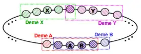 In the island model, also called the migration model or coarse grained model, evolution takes place in strictly divided subpopulations. These can be organised panmictically, but do not have to be. From time to time an exchange of individuals takes place, which is called migration.[2][5] The time between an exchange is called an epoch and its end can be triggered by various criteria: E.g. after a given time or given number of completed generations, or after the occurrence of stagnation. Stagnation can be detected, for example, by the fact that no fitness improvement has occurred in the island for a given number of generations. Island models introduce a variety of new strategy parameters:[11][12][13][14]
