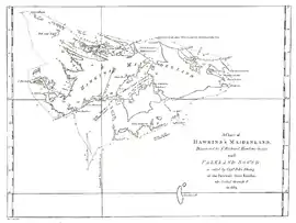 - ↑ J. MacBride. A chart of Hawkins’s Maidenland, discovered by Sr. Richard Hawkins in 1574 and Falkland Sound, so called by Capn. John Strong of the Farewell from London who sailed through it in 1689. Scale 1:1000000. In: An account of the voyages undertaken by the order of His present Majesty for making discoveries in the Southern Hemisphere. Eds. J. Hawkesworth and J. Byron. Vol. I. London: W. Strahan and T. Cadell, 1773 (following p. 40)