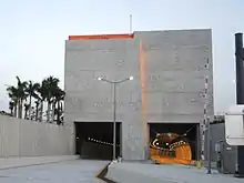 The Port of Miami Tunnel (also State Road 887) is a 4,200-foot (1,300 m)[3] bored, undersea tunnel in Miami, Florida. It consists of two parallel tunnels (one in each direction) that travel beneath Biscayne Bay, connecting the MacArthur Causeway on Watson Island with PortMiami on Dodge Island. It was built in a public–private partnership between three government entities—the Florida Department of Transportation, Miami-Dade County, and the City of Miami—and the private entity MAT Concessionaire LLC, which was in charge of designing, building, and financing the project and holds a 30-year concession to operate the tunnel.[4][5][6]
