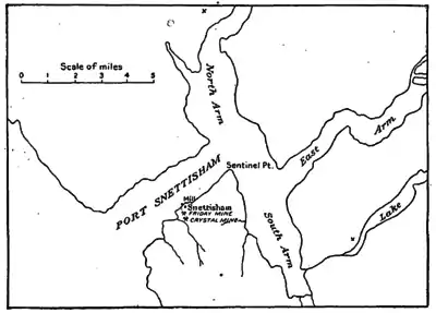 Several mineral deposits were discovered in the drainage basin of the port. The iron ore deposits identified in 1954 were located in a stretch of about 1,000 feet (300 m) to southwest of the Sentinel Point extending into the southeastern shore line of the port. It was suggested in 1954 to establish a small dock, deep enough for large ocean-going vessels.[5] Of all the deposits developed, gold was the chief mineral output, mined by the Alaska Snettisham Gold Mining Company which was established on the south shore of the Port Snettisham, 3 miles (4.8 km) from the entrance.[3]