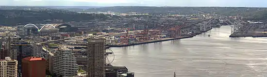 ![]() Aerial view of the Seattle harbor, 2022, showing numerous container terminals operated by the Port of Seattle | |