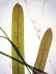 Flat-stalked pondweed grows annually from turions and seed, producing branching plants with slender, flattened stems that are well-branched. The submerged leaves are long, rather grass-like, sessile, and translucent. The leaf tips are mucronate (i.e. with the midrib extending out of the leaf, giving a pointed appearance).[4] Abundant turions are produced along the stem, especially in autumn as the plant disintegrates.