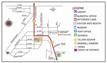 Highway 2 runs north–south through Pouce Coupe, connecting the town to Dawson Creek (10 km (6 mi) northwest) and Alberta (x km (xx mi) southeast). Pouce Coupe's internal street network has 14 km (8.7 mi) of paved and 5 km (3.1 mi) of unpaved road.[20] The village's commercial activities are centered on the bend in highway. The residential areas are located mostly south of the highway with a gridiron layout. Industry is located north of the highway and agriculture to the west.