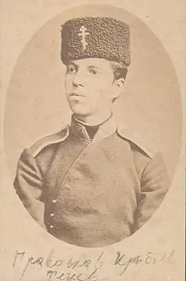 Pravoslav Tenev was born on 15 March 1862 in Varna. On 5 October 1879 he entered military service, and in 1882 he graduated from the Military School of Vasil Levski National Military University in Sofia and on 30 August he was promoted to the rank of lieutenant, enlisted in the Rahovska No. 12 infantry company . In April 1885 he was appointed subaltern-officer in the newly formed 8th Marine Regiment, and on 30 August 1885 was promoted to lieutenant.[1]