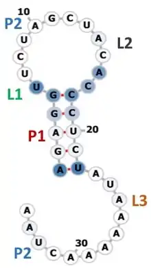 PreQ1 riboswitch has two stems and three loops, and its detailed structure has been shown on the right.[11] The riboswitching action of preQ1 riboswitches in bacteria is regulated by binding of metabolite preQ1 to the aptamer region leading to structural changes in the messenger RNA (mRNA) that governs the downstream genetic regulation.[12] The preQ1 riboswitch structure adopts a compact H-type pseudoknot, which makes it quite different from other purine based riboswitches.[12] The preQ1 ligand is buried in the pseudoknot core and stabilized through intercalation between helical stacks and hydrogen bond interaction with heteroatoms. In absence of preQ1, the P2 tail region is away from the P2 loop region and hence the riboswitch is observed to be in undocked (partially docked) state, whereas on the binding of preQ1 to the riboswitch results the two P2 regions to come closer causing a complete docking of riboswitch. This docking and undocking mechanism of riboswitch with the change in concentration of ligand preQ1 is observed to control the signaling of gene regulation, commonly known as “ON” or “OFF” signaling for gene expression.[11][13] The docking and undocking mechanism are observed to be affected not only by the ligand, but also with other factors like Mg salt.[14] Like any other riboswitch, the two most common types of gene regulation mediated by preQ1 riboswitch are through transcription attenuation or inhibition of translation initiation. Ligand binding to the transcriptional riboswitch in bacterial causes modification in the structure of riboswitch unit, which leads to hindrance in the activity of RNA polymerase causing attenuation of transcription. Similarly, binding of the ligand to the translational riboswitch causes modification in the secondary structure of riboswitch unit leading to hindrance for ribosome binding and hence inhibiting translational initiation.