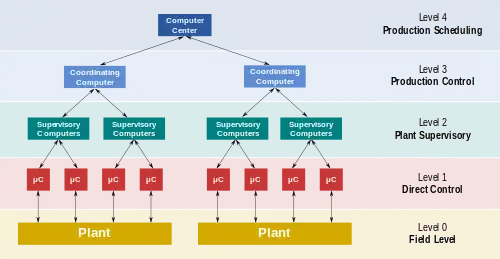 Referring to the diagram: Level 0 contains the field devices such as flow and temperature sensors (process value readings - PV), and final control elements (FCE), such as control valves; Level 1 contains the industrialized Input/Output (I/O) modules, and their associated distributed electronic processors; Level 2 contains the supervisory computers, which collate information from processor nodes on the system, and provide the operator control screens; Level 3 is the production control level, which does not directly control the process, but is concerned with monitoring production and monitoring targets; Level 4 is the production scheduling level.