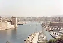 The Côtes de Provence AOC is a large noncontiguous wine region that covers over 85 communes in the eastern region of Provence. The boundaries of the region extend from the alpine hills near Draguignan to the coast of Saint-Tropez. The noncontiguous parts of the region include land southeast of the Palette AOC and on the outskirts of the Bandol and Cassis wine area. The mountainous terrain near Villars-sur-Var in the northeast part of the area includes vineyards that can label their wine as Côtes de Provence.[1] The region accounts for nearly 75% of all the wine production in Provence with rosé accounting for around 80% of the production. While the number is rising, about 15% of wine production is red wine with the remaining 5% white. The main grape varieties are Carignan, Cinsaut, Grenache, Mourvèdre and Tibouren with an increase in the use of Cabernet Sauvignon and Syrah. To improve quality, producers limit the amount of Carignan used in their rosé and red wine production, using the maximum of 40% permitted in the wine and mandating that at least 60% of the blend be composed of Grenache, Cinsaut, Mourvèdre and Tibouren.[4] There is also an AOC requirement that at least 20% of the rosé must be blended from wine produced by the saignee method of maceration.[1]
