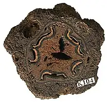 A transverse section through a Psaronius stem. ~12cm across.
