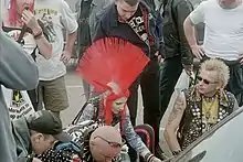The punk scene began to emerge in socialist East Germany in the late 1970s. It shared many similarities with that of the West and was considered by the ruling authorities to be a spread of an international youth sub-culture which had its roots in the U.S. and Western Europe. Indeed, this was an assessment many East German punks shared themselves. According to one, Mario Schulz, "The start was that I liked the music. I did not quite understand the English texts, but this ostentatious experience as an outsider, this capacity to shock, that pleased me. I was already- someone else would probably express it differently- an awkward sod."[99] By the authorities, punk was seen as representing a way of life which was contrary in nature to existing social conventions and values. Punks were, however, not the only youth sub-culture to be considered 'negative decadent'[100] and a threat to the stability of socialist society: heavy metallers, skinheads, and goths were also targeted. Whilst it is hard to ascertain an exact figure, the punk scene in East Germany in the early 1980s was still relatively small. For example, 'In 1981, the Stasi (secret police) identified 1,000 punks and a broader group of 10,000 sympathisers.'[101] Punks, whether considered as individuals or as groups, were persecuted by both the regular police and the Stasi. More overt methods of persecution by the regular police- such as enforced haircutting, arrest, and physical beatings- were combined unofficially with the more insidious and far-reaching decomposition methods (trans. Zersetzung) of the Stasi: these involved various forms of infiltration, false flag type acts, framing, psychological harassment methods designed to cause mental health problems, and incarceration on the basis of mental health legislation or on the basis of crimes ostensibly committed.[102] As the methods of the Stasi were difficult to detect and even harder to prove, it allowed them to circumvent international condemnation in regard to the persecution of their own citizens. Aside from being designed to harm people, the methods were also designed to discredit and isolate individuals and break up the various bands and groupings. They relied heavily on the hiring of collaborators who were of a similar disposition to those who were being targeted. According to Stasi officers, this was a task which was harder to achieve with punks due to their 'feeling of belonging together.'[103] Nonetheless, the Stasi did have notable success in the repression and decomposition of the punk scene. Former member of the band Namenlos, Jana Schlosser, stated in 1984 when she came out of jail, that "The Stasi had pretty well managed to smash punk."[103][104]