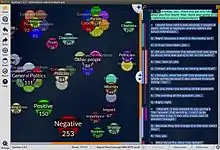 The interface is unique, in that it simultaneously displays visualisations and text data[5] and has identical capabilities on Windows, macOS and Linux. The thematic framework is represented with a series of circles, the size of each indicating the amount of data coded to them. Colors are used extensively to indicate the thematic bubble within the coding stripes on the text sources.[6] There are few features for quantitative or statistical analysis of text data, however project files can be exported for analysis in statistical software such as SPSS or R.