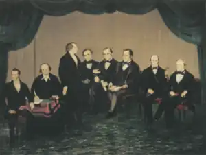 The quorum was first organized in 1835 and designated as a body of "traveling councilors" with jurisdiction outside areas where the church was formally organized, equal in authority to the First Presidency, the Seventy, the standing Presiding High Council, and the high councils of the various stakes.[2] The jurisdiction of the Twelve was originally limited to areas of the world outside Zion or its stakes. After the apostles returned from their missions to England, Joseph Smith altered the responsibilities of the quorum: it was given charge of the affairs of the church, under direction of the First Presidency.[3][4][5]
