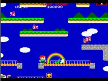 Rainbow Islands: The Story of Bubble Bobble 2 (レインボーアイランド) is a 1987 arcade video game developed and published by Taito,[1] with the arcade version licensed to Romstar for North American manufacturing and distribution. The game is the sequel to Bubble Bobble from the previous year, and it is the second of four arcade games in the series (followed by Bubble Symphony and Bubble Memories, but itself has two direct sequels: Parasol Stars and Bubble Bobble Part 2). The game was ported to home computers and home video game consoles.