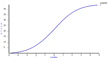 When all test-takers have an opportunity to attempt all items on a single test, each total score on the test maps to a unique estimate of ability and the greater the total, the greater the ability estimate. Total scores do not have a linear relationship with ability estimates. Rather, the relationship is non-linear as shown in Figure 1. The total score is shown on the vertical axis, while the corresponding person location estimate is shown on the horizontal axis. For the particular test on which the test characteristic curve (TCC) shown in Figure 1 is based, the relationship is approximately linear throughout the range of total scores from about 13 to 31. The shape of the TCC is generally somewhat sigmoid as in this example. However, the precise relationship between total scores and person location estimates depends on the distribution of items on the test. The TCC is steeper in ranges on the continuum in which there are more items, such as in the range on either side of 0 in Figures 1 and 2.