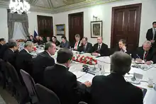 In 2009, Prime Minister Erdoğan's government announced a plan to help end the quarter-century-long Turkey–Kurdistan Workers' Party conflict that had cost more than 40,000 lives. The government's plan, supported by the European Union, intended to allow the Kurdish language to be used in all broadcast media and political campaigns, and restored Kurdish names to cities and towns that had been given Turkish ones.[71] Erdoğan said, "We took a courageous step to resolve chronic issues that constitute an obstacle along Turkey's development, progression and empowerment."[71] Erdoğan passed a partial amnesty to reduce penalties faced by many members of the Kurdish guerrilla movement PKK who had surrendered to the government.[72] On 23 November 2011, during a televised meeting of his party in Ankara, he apologized on behalf of the state for the Dersim massacre, where many Alevis and Zazas were killed.[73] In 2013 the government of Erdoğan began a peace process between the Kurdistan Workers' Party (PKK) and the Turkish Government,[74] mediated by parliamentarians of the Peoples' Democratic party (HDP).[75]