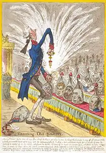 Having quickly made his name and fortune, in 1776 Sheridan bought David Garrick's share in the Drury Lane patent, and in 1778 the remaining share; his later plays were all produced there.[14] In 1778 Sheridan wrote The Camp, which commented on the ongoing threat of a French invasion of Britain. The same year Sheridan's brother-in-law Thomas Linley, a young composer who worked with him at Drury Lane Theatre, died in a boating accident. Sheridan had a rivalry with his fellow playwright Richard Cumberland and included a parody of Cumberland in his play The Critic. On 24 February 1809 (despite the much vaunted fire safety precautions of 1794) the theatre burned down. On being encountered drinking a glass of wine in the street while watching the fire, Sheridan was famously reported to have said, 'A man may surely be allowed to take a glass of wine by his own fireside.'[15] Sheridan was the manager of the theatre for many years, and later became sole owner with no managerial role.