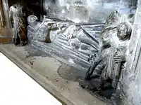 Sir Richard was also buried in Exeter Cathedral, near his brother the bishop, against the north wall across the north ambulatory from the bishop's tomb. His tomb is marked by an elaborate monument comprising a recessed ogee shaped niche set into the wall, containing his recumbent effigy, in the form of a cross-legged knight, which style supposedly represents crusaders. At the effigy's head stands a small statue of a man and at the feet a horse with an even smaller statue of a man holding its reins. According to Prince (d. 1723)[17] this last group refers to the tradition of the cripple who seised the foreleg of Sir Richard's horse at Cripplegate and thereby threw him off his horse into the hands of the murderous mob. It is however more likely that the figures are "a touching early fourteenth century visual representation of the Knight with his immediate following ... a knight is shown accompanied by his squire, page and horse".[18] The Devon historian Sir William Pole (d. 1635) stated that the arms of Stapledon (Argent, two bends wavy sable) were displayed on the shield of the effigy,[19] but today no trace of colour remains. These arms are however still visible (possibly restored) on the nearby monument to his brother the bishop.