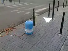 Preformed thermoplastic pavement markings (sometime called "tape", but not to be confused with preformed polymer tape) are thermoplastic cut into the final shapes by the manufacturers and ready to position onto an asphalt or concrete pavement surface. Preformed thermoplastics are put into place on the road surface and applied using a propane heat torch. Some models require heating the road surface prior to the placement of the preformed thermoplastics. These markings are used primarily because of their durability and cost-effective service life. Since the plastics are melted into the surface, they are not easily damaged by snowplows. Typically, the preformed thermoplastic markings can last 3 to 6 years. The most common applications of preformed thermoplastic pavement markings are found at intersections as transverse markings such as stop lines, legends, crosswalks, arrows, bike lane symbols, and accessibility symbols.[11][13]