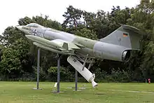 Static display of a Lockheed F-104G aircraft in German National livery fitted with a Rocketdyne zero length launch rocket engine.
