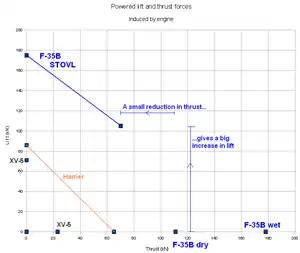 In comparison, the maximum thrust of the Rolls-Royce Pegasus 11-61/F402-RR-408, the most powerful version which is used in the AV-8B, is 23,800 pounds-force (106 kN).[19] The weight of the AV-8B is about 46% of the weight of the F-35B.