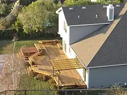 The deck of a house is generally a wooden platform built above the ground and connected to the main building. It is generally enclosed by a railing for safety. Access may be from the house through doors and from the ground via a stairway. Residential decks can be constructed over steep areas or rough ground that is otherwise unusable. Decks can also be covered by a canopy or pergola to control sunlight. Deck designs can be found in numerous books, do-it-yourself magazines and websites, and from the USDA.[8]