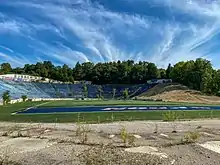 On June 28, 2012, it was revealed that local marketing company Team1 Marketing Group of Canton was pursuing the Rubber Bowl for a potential United States Football League (USFL) team called the Akron Fire. Sean Mason of Team1 argued that even though InfoCision Stadium is newer, the Akron Fire's ability to generate revenue would be less due to the University of Akron controlling concession and marketing rights, and by buying the Rubber Bowl outright it could also be used for other sporting events and concerts. The Rubber Bowl was purchased by Team1 Marketing in January 2013 for $38,000, with several improvements planned such as updates to the press box, locker rooms, and concession areas, along with new scoreboards and seating. The company announced plans to acquire a USFL franchise;[9][10] the team was planned to be named the Akron Fire, but in July 2013 it was announced that the league's plans no longer included the Akron team.[11] Team1 announced on April 17, 2014 that the stadium would instead be used as a multi-use entertainment facility and that it would have a dome built over it.[12] On April 2, 2015 it was revealed that the non-profit Minor League Football Team named the Summit County Storm would be playing football in the revived stadium along with its multi-use entertainment.[13] The first event in the stadium under Team1 was scheduled for May 15, 2015, a hip-hop concert and party fest known as LOUD-Fest, produced by a local music company.[14] However, the event was rescheduled to another location "due to concerns about the dilapidated stadium".[15] On April 5, 2017 the County of Summit foreclosed on the stadium with plans to allow Team1 to lease the stadium and repurpose it for mixed use entertainment.[16] Team1 gave up the deed on August 29, 2017 allowing the city of Akron to become full-time owners after Team1 announced that they failed to attract attention to the structure.[17] Akron announced on September 22, 2017 that the stadium would be demolished.[18] Demolition began in 2018 with the scoreboard and the western portion of the stadium closest to Derby Downs, which included the press box, being razed, while the east and south tiers, which are built into the adjacent hill, remaining. The portion built into the hillside supported George Washington Boulevard, and removal could potentially cause the roadway to collapse.[19][20][21] In 2023, the remainder of the stadium was demolished with the hillside portion of the stadium reinforced with concrete to form a retaining wall for the roadway above and transform the structure into a grassy hill.[22]