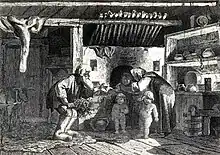 Emelya from "At the Pike's Behest" was so reluctant to leave it that he simply rode on it.[12][13][14] Baba Yaga from fairy tales baked lost children in her stove. In fairy tales the stove may receive human characteristics. For example, in "The Magic Swan Geese" a girl meets a Russian stove, and asks it for directions. The stove offers the girl rye buns, and subsequently, on the girl's return, hides her from the swan geese.[15][16]