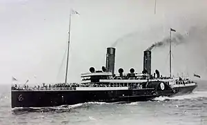 On the bridge deck there were situated 10 State Rooms, forward of this was situated a smoke room for the cabin passengers.[6] A new feature for ships of the Isle of Man Steam Packet was the promenade (or flying deck) which was used as a promenade by saloon passengers and extended from forward of the boiler room to aft of the first class cabins.[6] Buoyant seats ran practically the full length of the deck, except for the after part of the deck which was required for the ship's lifeboats. Altogether the promenade deck covered three quarters of the length and the whole breadth of the ship.[6]