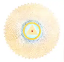 The Sahasrara is described as a lotus flower with 1,000 petals of different colors. These are arranged in 20 layers, each with approximately 50 petals. The pericarp is golden and within it a circular moon region is inscribed with a luminous triangle, which can be either upward- or downward-pointing.[3]