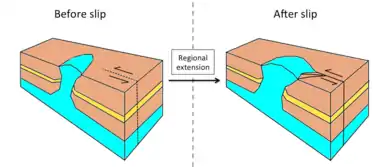 Tensional stress affects salt structure deformation by (1) forming fractures in the overlying rocks, thinning of overburden and reduction of strength of overburden, (2) developing a graben in overburden that favors gravitational differential loading.[16] Most salt diapirs in the world were initiated during regional extension, implying that salt diapirism is primarily activated by tensional stress.[1][10]