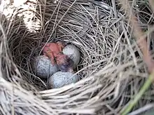 Saltmarsh sparrows are non-territorial and have large overlapping home ranges. Male home ranges are twice as large as those of females and may span 50 hectares (120 acres).[22] Saltmarsh sparrows are promiscuous, and the majority of broods exhibit mixed parentage.[23] During the nesting season, males roam long distances chasing and mounting females regardless of receptivity. Only females exhibit parental care, building the nest, incubating the eggs, and providing food to the young.[12] The nest is an open cup constructed of grass, usually attached to saltmeadow cordgrass (Spartina patens) or saltmarsh rush (Juncus gerardii) at a height of 6–15 centimetres (2.4–5.9 in). Clutch size is 3 to 5. Incubation begins after the last egg is laid and takes 11–12 days. Young fledge 8–11 days after hatching but remain dependent on the mother for an additional 15–20 days.[19]