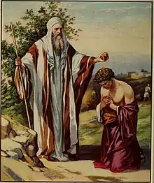 Samuel (Hebrew: שְׁמוּאֵל Šəmūʾēl, Tiberian: Šămūʾēl)[1] is a male given name and a surname of Hebrew origin. It means "name of God", deriving from the Hebrew Shem (שֵׁם) (which means "name")[2] + ʾĒl (which means "God" or "deity").[3] However, from the explanation given in 1 Samuel 1:20, the name could alternatively come from a contraction of the Hebrew שְׁאִלְתִּיו מֵאֵל (Modern: Šəʾīltīv mēʾĒl, Tiberian: Šĭʾīltīw mēʾĒl), meaning "I have asked/borrowed him from God".[4][5] This is the verse in which the Prophet Samuel's mother Hannah names her son, after praying that she would be able to give birth. Her prayers having been answered, she dedicates the child to God as a Nazirite. Samuel was the last of the ruling judges in the Old Testament. He anointed Saul to be the first King of Israel and later anointed David.