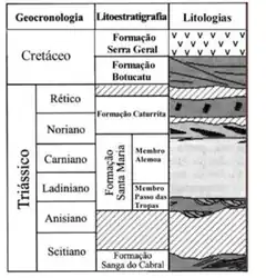 - 1 2 Zerfass, Henrique; Lavina, Ernesto Luiz; Schultz, Cesar Leandro; Garcia, Antônio Jorge Vasconcellos; Faccini, Ubiratan Ferrucio; Chemale, Farid (2003-09-01). "Sequence stratigraphy of continental Triassic strata of Southernmost Brazil: a contribution to Southwestern Gondwana palaeogeography and palaeoclimate". Sedimentary Geology. 161 (1): 85–105. Bibcode:2003SedG..161...85Z. doi:10.1016/S0037-0738(02)00397-4. ISSN 0037-0738.