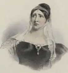 In 1818, Mrs. Bartley accompanied her husband to America,[5] where she obtained both reputation and fortune.[6] Returning in 1820 she played in the country, and on 15 November 1823 reappeared at Covent Garden as Mrs. Beverley in the 'Gamester.' Her performances were, however, infrequent. In the character of Lady Macbeth she finally retired from the stage.