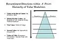 8) Pathological Ressentiment ultimately manifests as "Metaphysical Confusion". Metaphysical Confusion is a form of Value Delusion in which the value shift is more vertical in character,[36] in relation to the apriori hierarchy of value modalities. In this dimension, Value Delusion occurs a sort of twisting, or false inversion, of the value hierarchy wherein higher value-contents and bearers are viewed as lower, and lower as higher. Today we commonly refer to this phenomenon as "Having One's Priorities Out of Order." Scheler illustrated such an inversion in his analysis of Western civilizations humanistic, materialistic and capitalistic propensities to elevate utility values above those of vital values.[37][38] Carried to the logical extreme, "Ressentiment brings its most important achievement when it determines a whole "morality," perverting the rules of preference until what was "evil" appears "good".[39]
