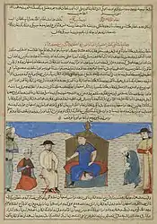 - Turkic amir with guards in Maqamat al-Hariri, wearing the sharbush headgear, the three-quarters length robe, and boots, at Rayy, Iran, 1227.[113][114]