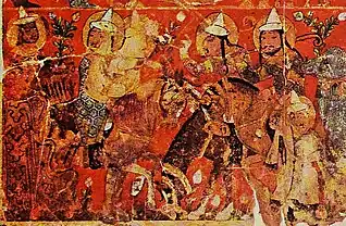 In 1040, at the Battle of Dandanaqan, Seljuks decisively defeated Mas'ud I of Ghazni, forcing him to abandon most of his western territories.[31] Afterwards, Turkmens employed Khorasanians and set up a Persian bureaucracy to administer their new polity with Tughril as its nominal overlord.[32] By 1046, Abbasid caliph al-Qa'im had sent Tughril a diploma recognizing Seljuk rule over Khurasan.[33] In 1048–1049, the Seljuk Turks, commanded by Ibrahim Yinal, uterine brother of Tughril, made their first incursion into the Byzantine frontier region of Iberia and clashed with a combined Byzantine-Georgian army of 50,000 at the Battle of Kapetrou on 10 September 1048. The devastation left behind by the Seljuk raid was so fearful that the Byzantine magnate Eustathios Boilas described, in 1051–1052, those lands as "foul and unmanageable... inhabited by snakes, scorpions, and wild beasts." The Arab chronicler Ibn al-Athir reports that Ibrahim brought back 100,000 captives and a vast booty loaded on the backs of ten thousand camels.[34] In 1055, Tughril entered Baghdad and removed the influence of the Buyid dynasty, under a commission from the Abbasid caliph.[33]