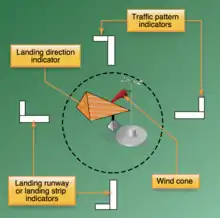 At airports without an operating control tower, a segmented circle visual indicator system, if installed, is designed to provide traffic pattern information. Usually located in a position affording maximum visibility to pilots in the air and on the ground and providing a centralized location for other elements of the system, the segmented circle consists of the following components: wind direction indicators such as windsocks, landing direction indicators, landing strip indicators, and traffic pattern indicators.[11]
