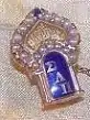 The badge of Sigma Lambda Pi was in the shape of an arch with a crown surmounting it.[2] The arch had seven pearls, the crown ten pearls, and there was a sapphire at the top.[2] The badge's exposed gold was nugget finished, and the letters were gold on a background of gold.[2] The fraternity's colors were sapphire blue and gold.[2] Its motto was "Dum Vivimus Fratres Vivamus" whose English translation is "while we live, let us live as brothers".[2] Its flower was the Carnation.[4]
